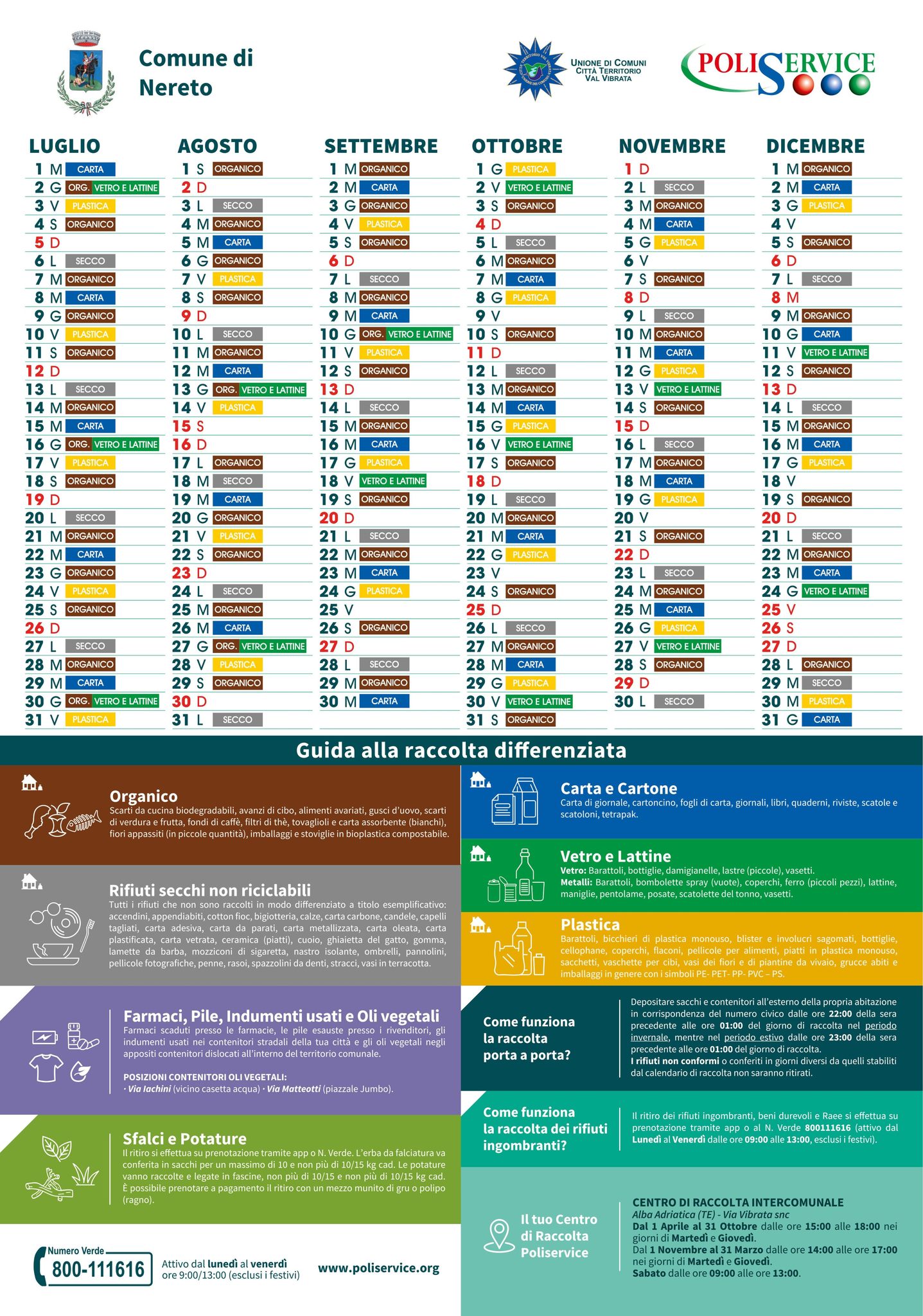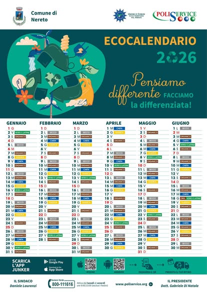 Si allega il nuovo calendario rifiuti pubblicato dalla Poliservice per il comune di Nereto per l'annualità 2026. Il Calendario cartaceo è disponibile presso gli uffici della Poliservice in Piazza Marconi, 1 nei giorni di Martedì 10.00 – 13.00 / 15.00 - 17.30 Venerdi 10.00 - 13.00. L'ufficio tecnico.