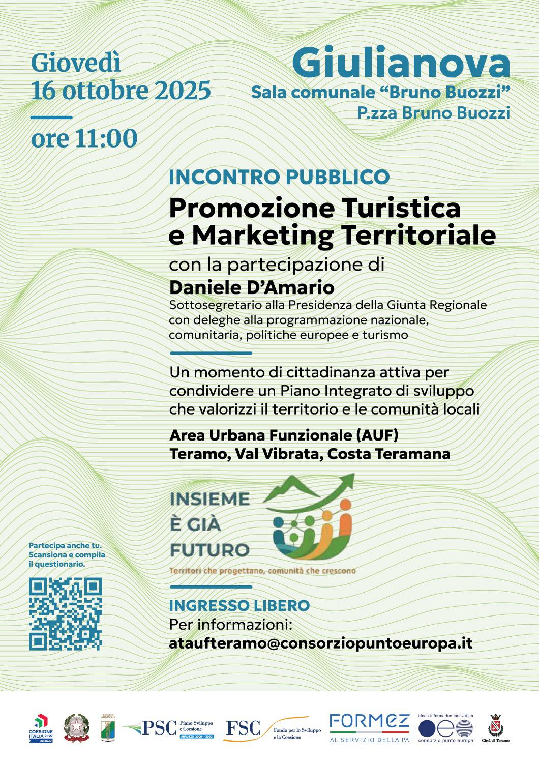 E’ organizzato dall’Area Urbana Funzionale di Teramo, Val Vibrata, Costa Teramana, l’incontro pubblico che si terrà giovedì 16 ottobre alle 11:00, nella sala Bruno Buozzi di Giulianova Alta. Il convegno, che approfondirà i temi strategici della promozione turistica e del marketing territoriale, vedrà la partecipazione di Daniele D’Amario, Sottosegretario alla Presidenza della Giunta regionale con deleghe alla programmazione nazionale, comunitaria, politiche europee e turismo.